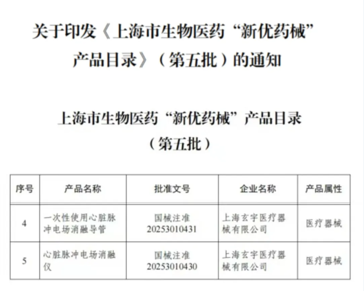 近日,上海市科学技术委员会发布《上海市生物医药“新优药械”产品目录(第五批)》,上海玄宇医疗器械有限公司(以下简称“玄宇医疗”)自主研发的SHINERHYTHM®心脏脉冲电场消融仪及RHYTHPULSE®一次性使用心脏脉冲电场消融导管成功入选,标志着国产高端医疗器械在心脏电生理领域实现重大突破,为房颤患者提供更安全、高效的治疗选择。