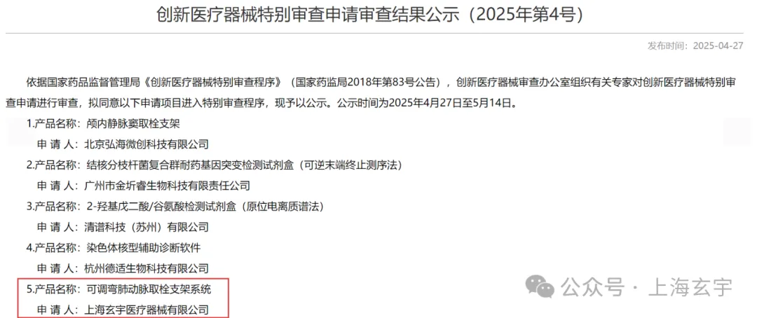 近日,国家药品监督管理局(NMPA)医疗器械技术审评中心发布了创新医疗器械特别审查申请审查结果公示(2025年第4号),同意玄宇医疗的可调弯肺动脉取栓支架系统进入特别审查程序(即绿色通道)。