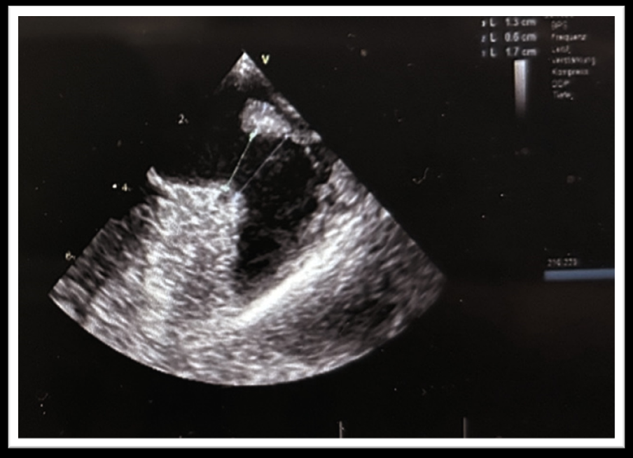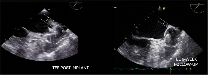 在LSPV中,将 Faradrive® 鞘管通过导丝置换成 Boston Scientific双向可调弯 14Fr 输送鞘管。使用 6 Fr猪尾巴导管将WATCHMAN14Fr 输送鞘管引导至 LAA,并在RAO30°、CRA15° 和CAU20° 角度下进行造影。造影或 TEE 上的 LAA 着陆区最大直径为 22.8 mm(图1),因此选择了WATCHMAN FLX™ 27 mm封堵器。该封堵器在LAA中推送(图 2),并且可以在第一次尝试时成功植入,而无需重新定位。在多普勒序列中,没有观察到残留漏。患者出院时接受了双重治疗,即每日两次服用150mg达比加群作为直接口服抗凝剂 (DOAC) + 阿司匹林,并计划在手术后 6 周进行TEE随访。有趣的是,TEE 显示嵴部部水肿完全消退,封堵器近端轻微移动。压缩保持22mm,封堵令人满意,因此DOAC治疗(每日两次服用150mg达比加群)中断,继续服用阿司匹林。在 6个月的随访期间,未记录到中风或出血,也未记录到复发的房颤。