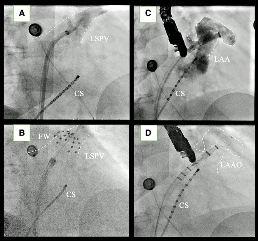 图表2( A ) RAO左上肺静脉造影透视图像 ( B ) 使用 31 mm 脉冲场消融导管 (Farawave®) 在RAO 30° 左上肺静脉中进行肺静脉隔离的透视图像。( C ) RAO向 30°CAR15° 的左心耳造影的透视图像。( D ) 使用 27 mm WATCHMAN FLX™ 在RAO 30°CRA15° 进行的左心耳封堵的透视图像。可以看到 LAA-PV嵴部的术中水肿。在所有图像中都可以看到位于冠状窦中的CS导管。
